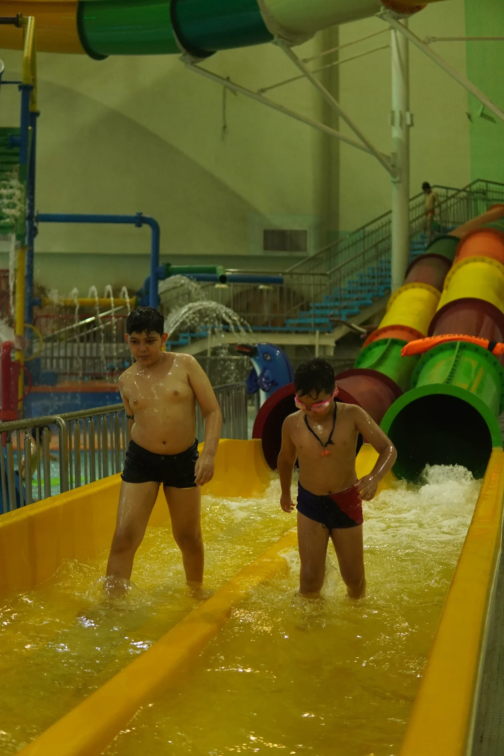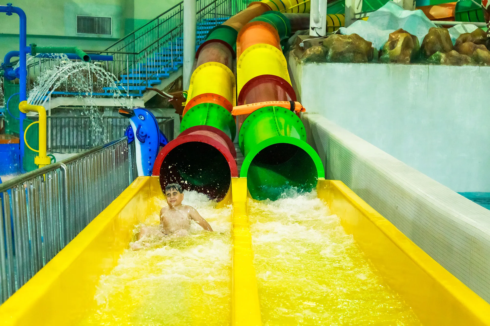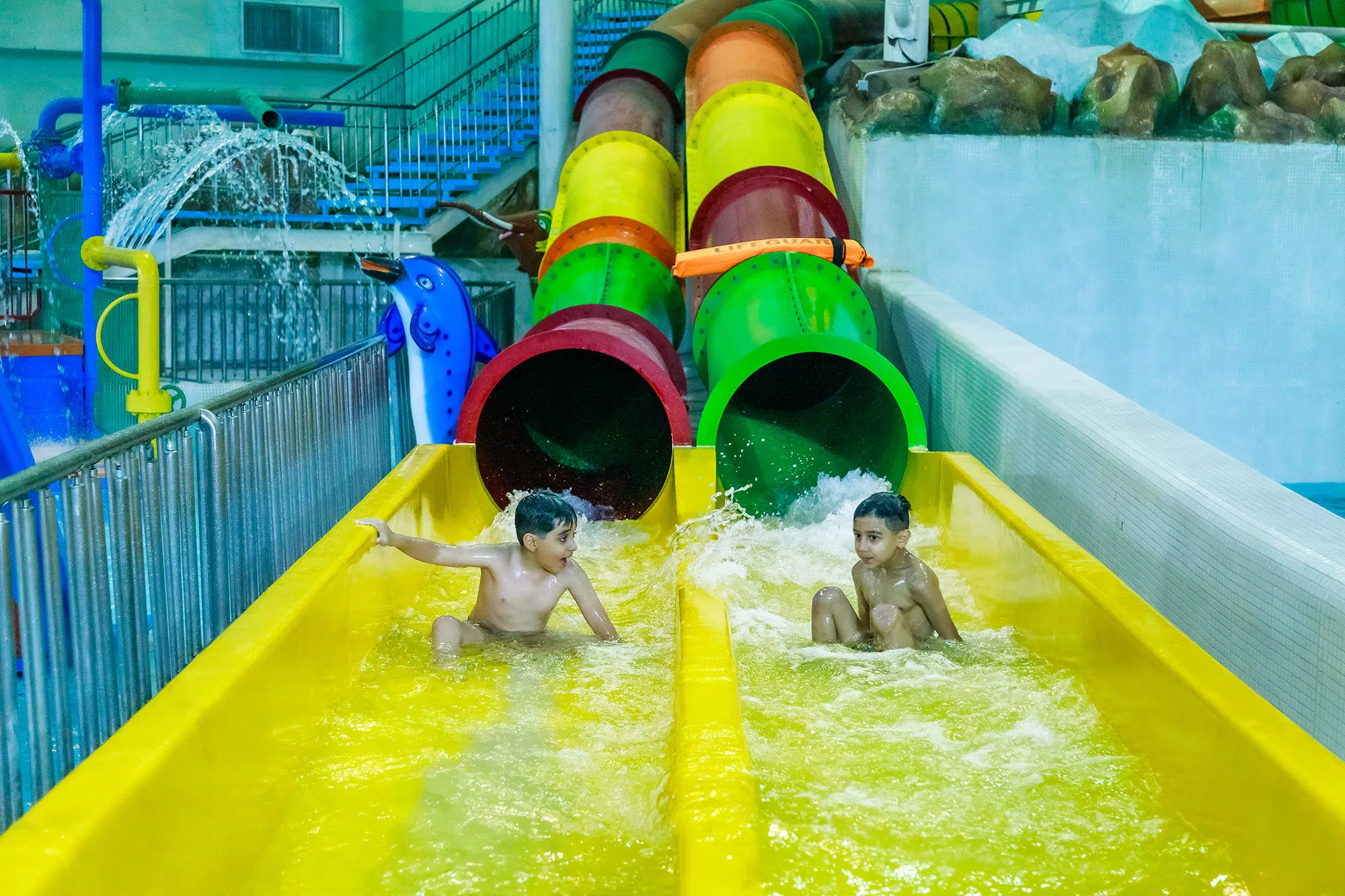 دو سرسره موازی و رنگی برای رقابت و سرگرمی هم‌زمان کودکان. هیجانی ساده و بی‌خطر!